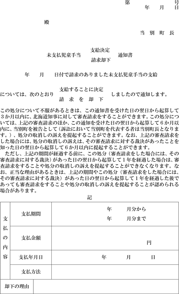 第7条 町長は、施行規則第9条第1項の未支払児童手当請求書の提出を受けたときは、その内容を審査し、未支払児童手当支給決定・請求却下通知書(