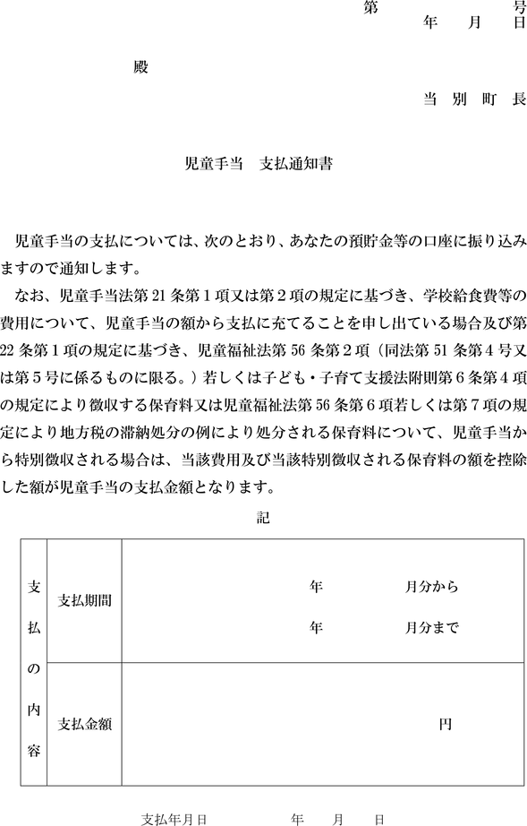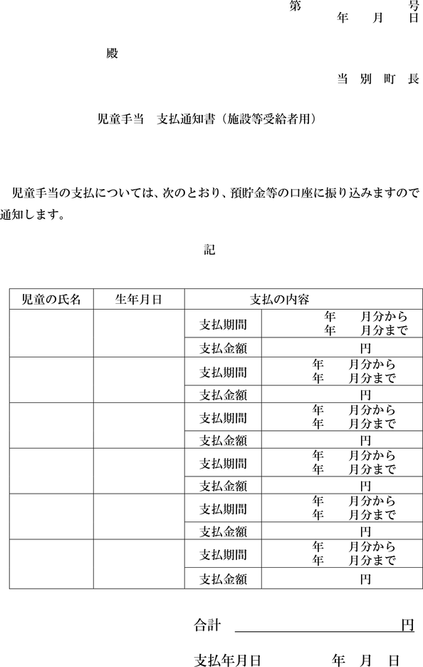 別記様式第9号)を、施設等受給者に児童手当の支払いを行う場合には、児童手当支払通知書(施設等受給者用)(