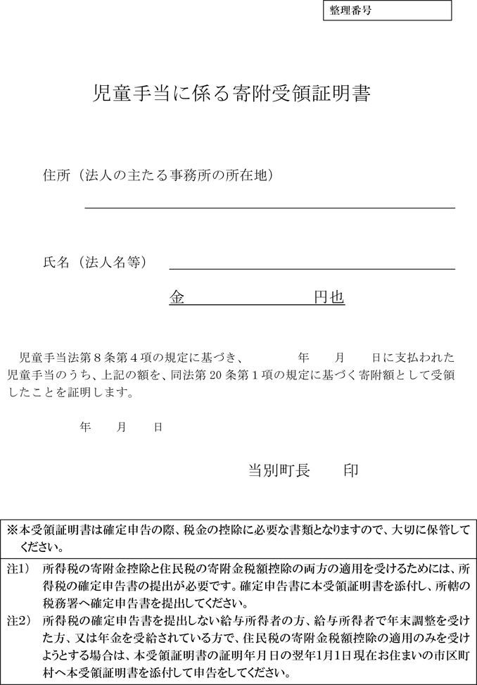 3 町長は、前項に規定する寄附が行われたときは、児童手当に係る寄附受領証明書(