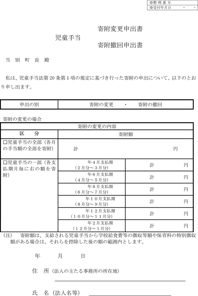 別記様式第14号。以下「寄附変更等申出書」という。)により、寄附が受領される前に行うものとし、寄附変更等申出書の提出された日以後に支払われるべき児童手当等を対象とする。