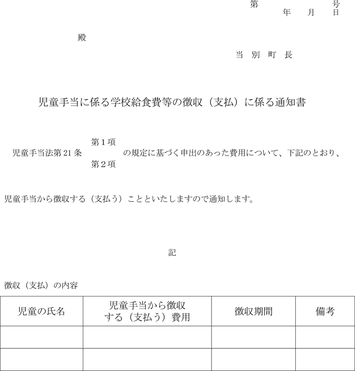 2 町長は、徴収等申出書の提出を受け、当該申出書の記載事項等により徴収等を行う場合には、児童手当に係る学校給食費等の徴収(支払)に係る通知書(