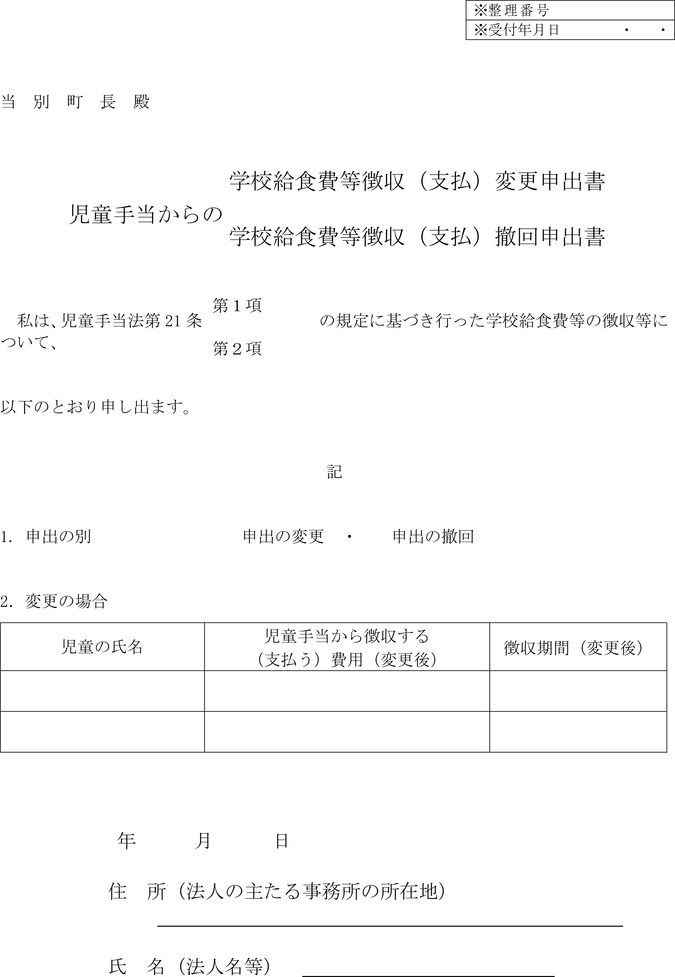 3 請求者等は、徴収等の内容を変更し、又は徴収等を撤回しようとするときは、児童手当からの学校給食費等徴収(支払)変更・撤回申出書(
