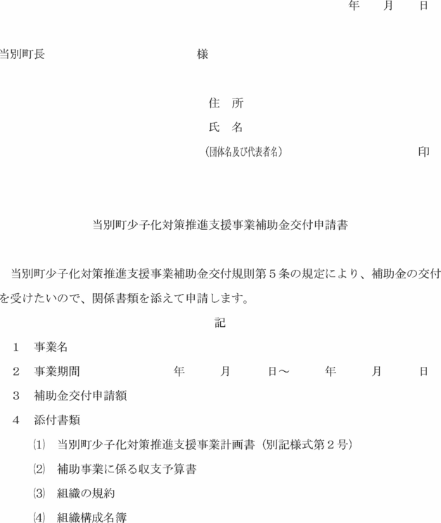 第5条 補助金の交付を受けようとする者(以下「申請者」という。)は、当別町少子化対策推進支援事業補助金交付申請書(