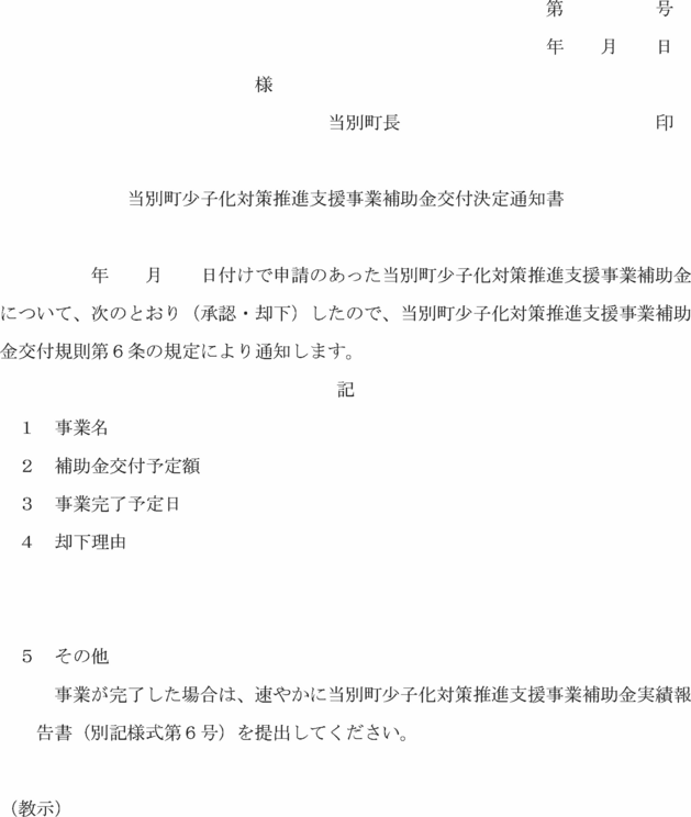 第6条 町長は、前条の規定により申請書を受理したときは、速やかに内容を精査し、当別町少子化対策推進支援事業補助金交付決定通知書(