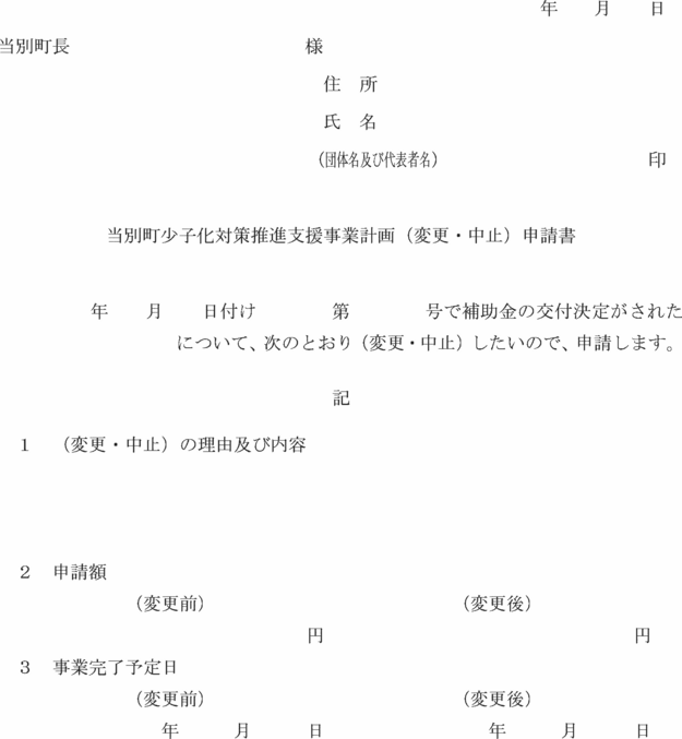 第7条 申請者は、当該事業に計画変更が生じた場合又は事業を中止する場合には、その理由を付して速やかに当別町少子化対策推進支援事業計画(変更・中止)申請書(
