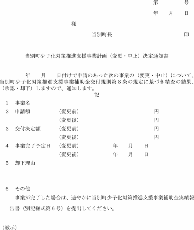 第8条 町長は、前条の規定により申請書を受理したときは、その内容を精査し、当別町少子化対策推進支援事業計画(変更・中止)決定通知書(
