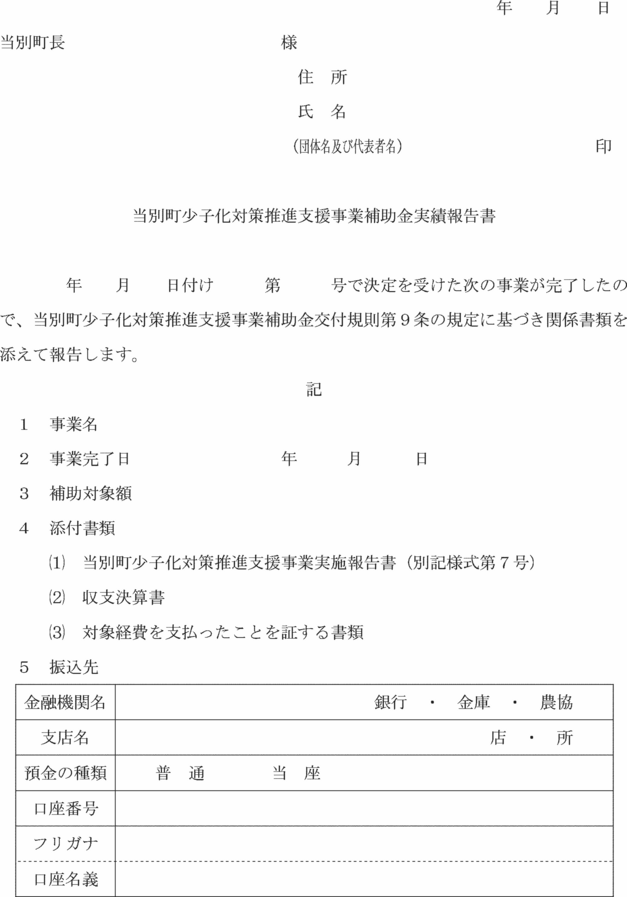 第9条 第6条又は前条の規定により事業の決定又は計画変更の承認の通知を受けた者(以下「事業者」という。)は、事業終了後速やかに当別町少子化対策推進支援事業補助金実績報告書(