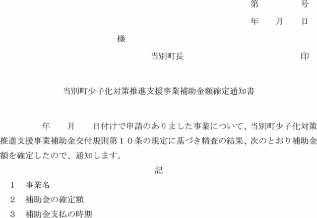 第10条 町長は、前条の規定により報告書が提出された場合には、その内容を精査し、適当と認めたときは、交付すべき補助金額を確定し、当別町少子化対策推進支援事業補助金額確定通知書(