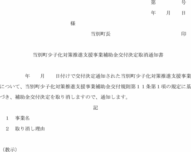 2 町長は、前項の規定による取り消しをする場合には、当別町少子化対策推進支援事業補助金交付決定取消通知書(
