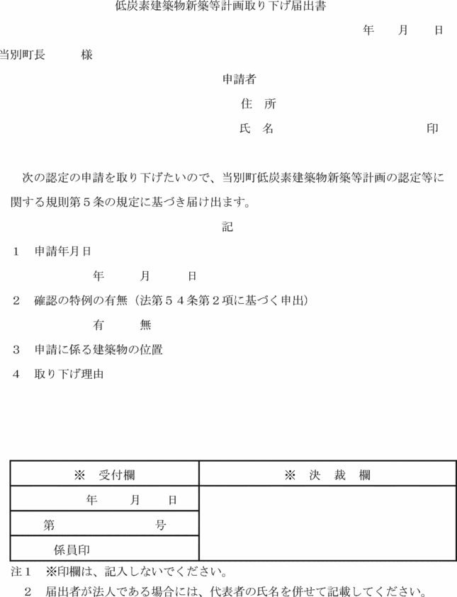 第6条 申請者は、認定を受ける前に申請を取り下げるときは、低炭素建築物新築等計画取り下げ届出書(