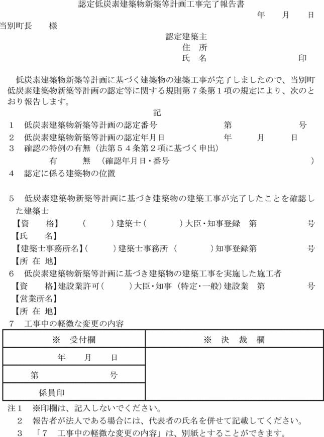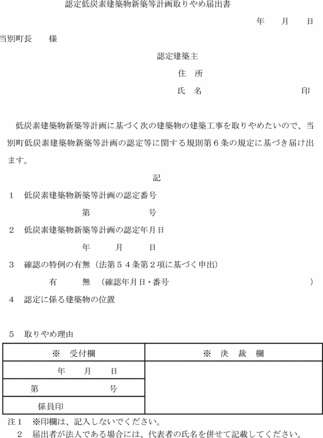 第7条 計画の認定を受けた者(以下「認定建築主」という。)は、認定低炭素建築物新築等計画の建築を取りやめるときは、認定低炭素建築物新築等計画取りやめ届出書(