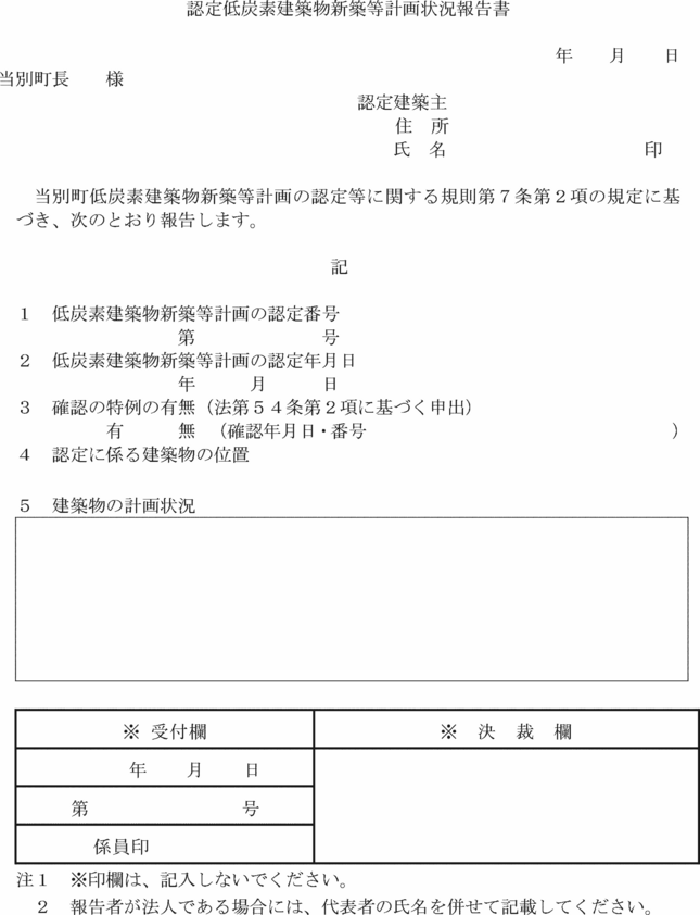 2 法第56条の規定により町長から報告を求められた認定建築主は、町長が定める日までに認定低炭素建築物新築等計画状況報告書(
