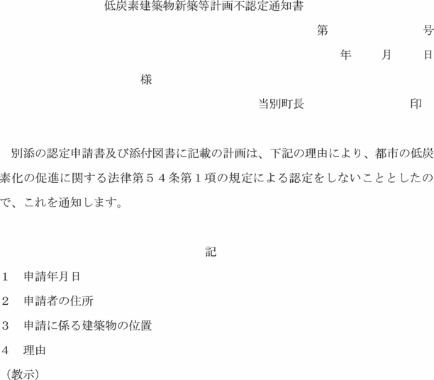 第9条 町長は、計画の申請(変更の場合を含む。)を認定しない場合は、低炭素建築物新築等計画不認定通知書(