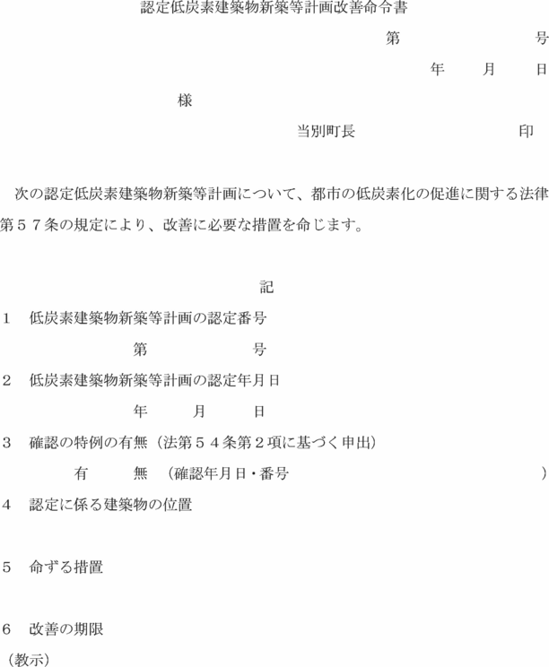 第10条 法第57条に規定する改善命令は、町長が必要と認めるときに、認定低炭素建築物新築等計画改善命令書(