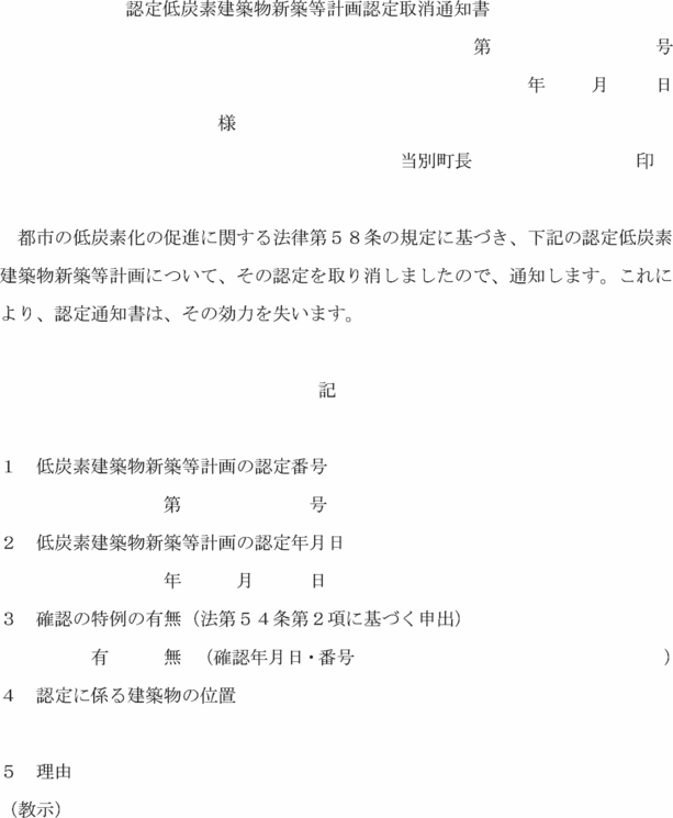 第11条 法第58条の規定による認定の取消しは、町長が必要と認めるときに、認定低炭素建築物新築等計画認定取消通知書(