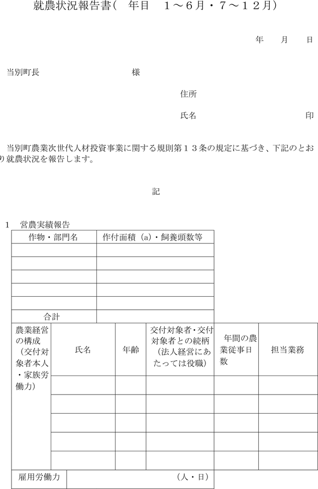 別記様式第6号)を経営開始計画書に記載した経営開始時期及び経営開始時期から半年ごとに、町長に提出しなければならない。