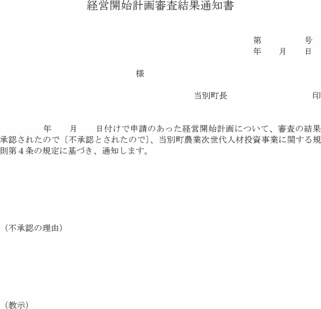 第4条 町長は、前条に規定する申請があったときは、その内容を審査し、経営開始計画の申請をした交付対象者(以下「承認申請者」という。)に対し、経営開始計画審査結果通知書(