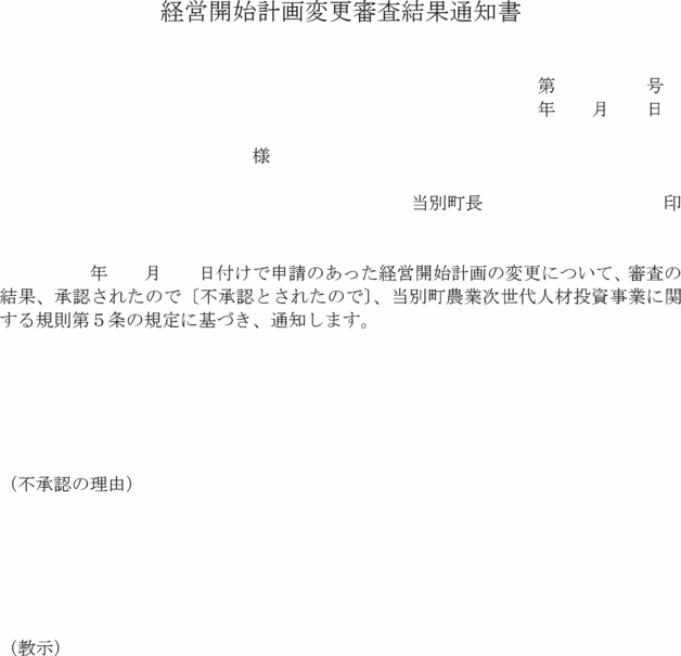 2 町長は、前項に規定する申請があったときは、前条の規定に準じて審査し、当該承認申請者に対し、経営開始計画変更審査結果通知書(