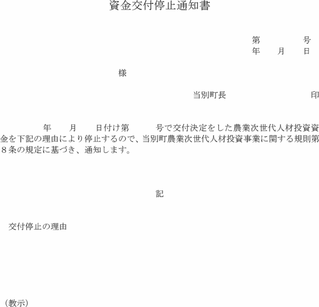 第8条 町長は、資金の交付を受けた者(以下「受給者」という。)が実施要領第4の3の(3)のアからキに掲げる事項に該当するときは、当該受給者に対し、資金交付停止通知書(