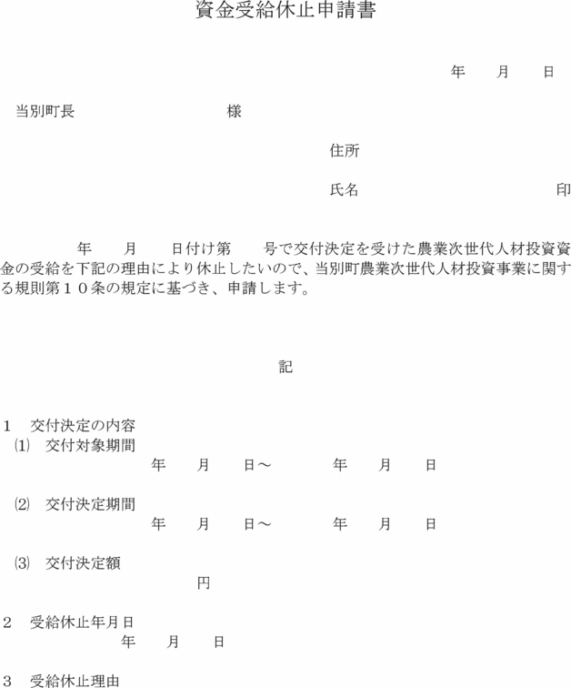 第10条 受給者は、病気、災害等のやむを得ない理由により就農を休止し、資金の受給を休止するときは、資金受給休止申請書(