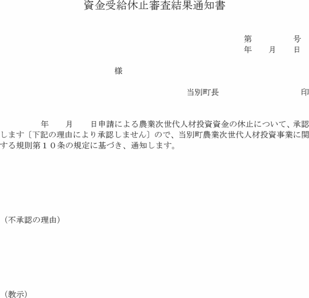 3 町長は、前2項に規定する申請があったときは、その内容を審査し、資金受給休止審査結果通知書(