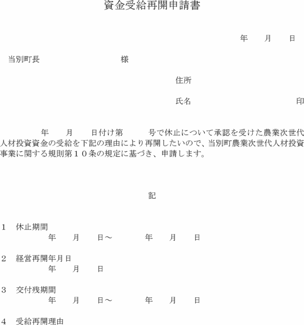 4 前項に規定する資金の交付の休止を承認された受給者は、就農を再開し、資金の交付を再開するときは、資金受給再開申請書(