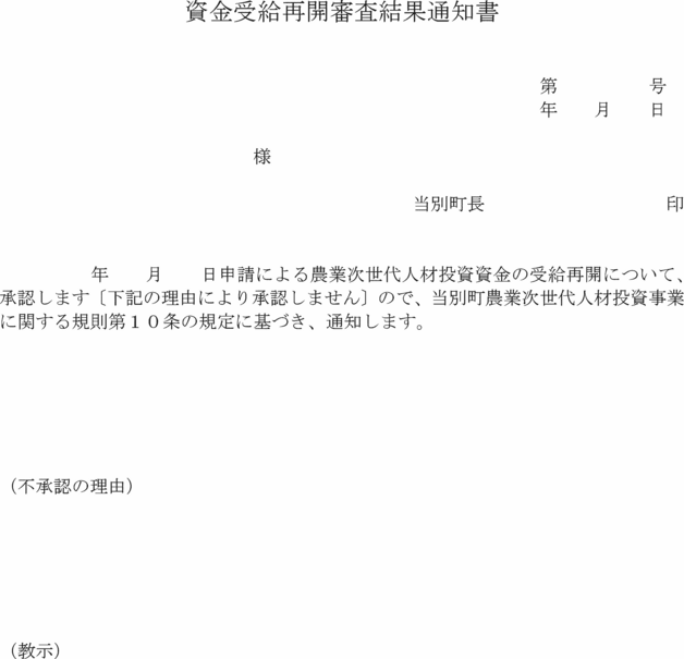 5 町長は、前項に規定する申請があったときは、その内容を審査し、資金受給再開審査結果通知書(