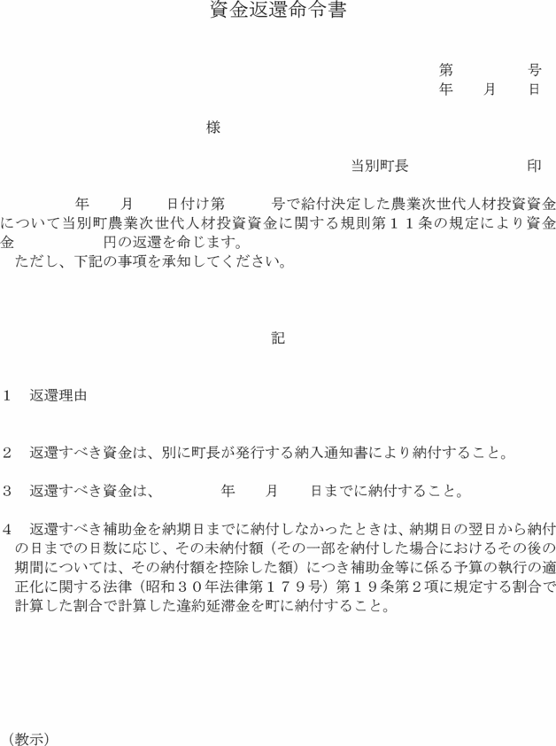 第11条 町長は、受給者が実施要領第4の3の(4)のアからウに掲げる事項に該当するときは、当該受給者に対し、資金返還命令書(