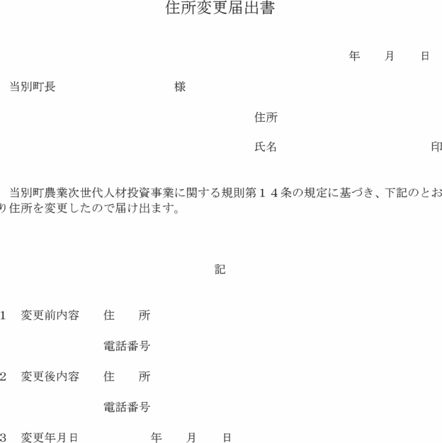 第14条 受給者は、交付期間内及び交付期間終了後5年間に住所を変更したときは、変更後1月以内に住所変更届出書(