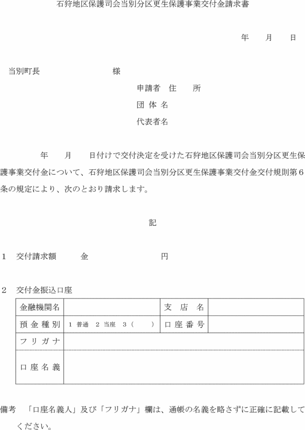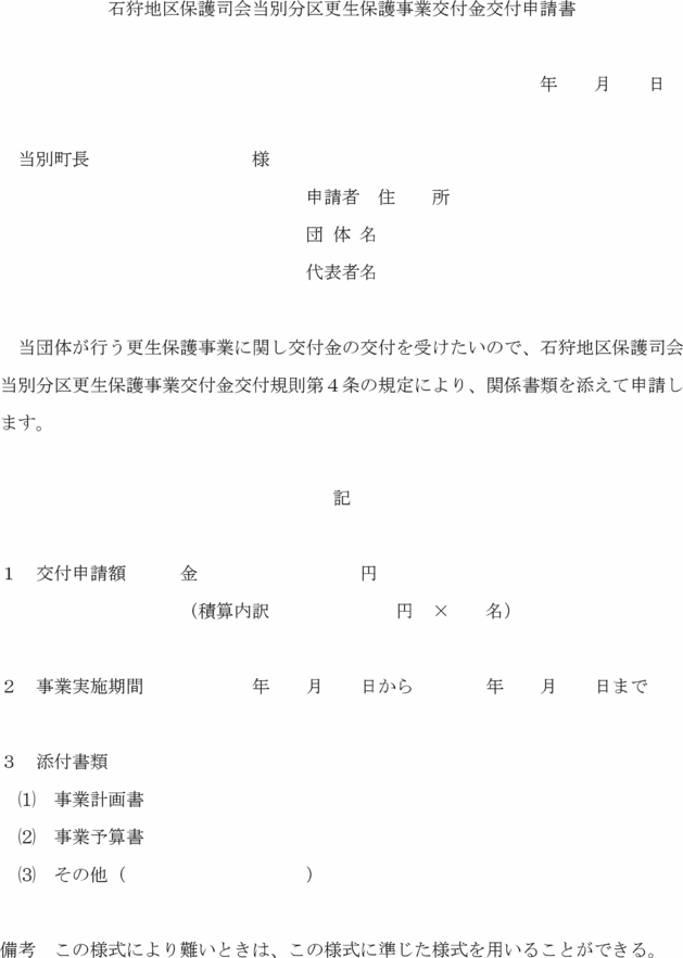 第4条 交付金の交付を受けようとする保護司会の長は、当該年度の5月末日までに、石狩地区保護司会当別分区更生保護事業交付金交付申請書(