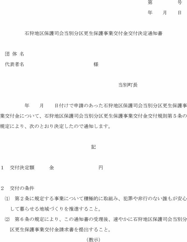 第5条 町長は、前条の規定による申請書を受理したときは、その内容を審査し、当該申請が適正であると認められる場合には交付金の額を決定し、石狩地区保護司会当別分区更生保護事業交付金交付決定通知書(