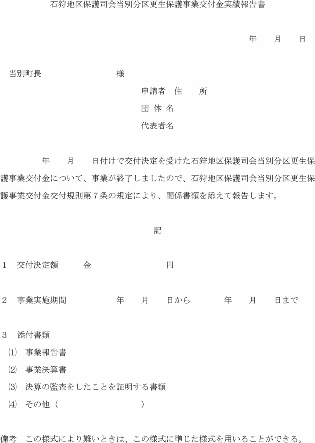 第7条 保護司会の長は、当該年度の決算終了後、石狩地区保護司会当別分区更生保護事業交付金実績報告書(
