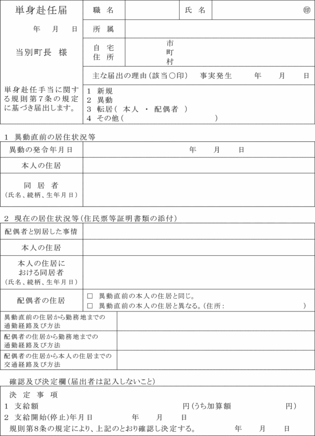 別記様式第1号)により、配偶者等との別居の状況等を速やかに町長に届け出なければならない。単身赴任手当を受けている職員の住居、同居者、配偶者等の住居等に変更があった場合についても、同様とする。