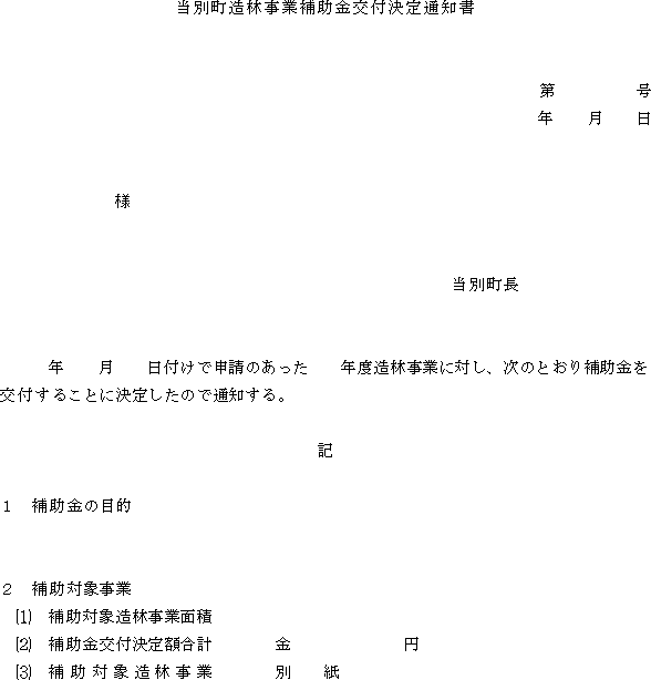 第4条 町長は、前条の規定による補助金の交付申請があったときは、その内容を審査し、補助金を交付すべきとものと認めるときは、速やかに補助金の交付の決定(以下「交付決定」という。)を行い、当別町造林事業補助金交付決定通知書(