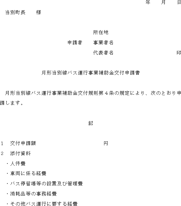 第4条 補助金の交付を受けようとする事業者(以下「申請者」という。)は、町長が定める日までに月形当別線バス運行事業補助金交付申請書(
