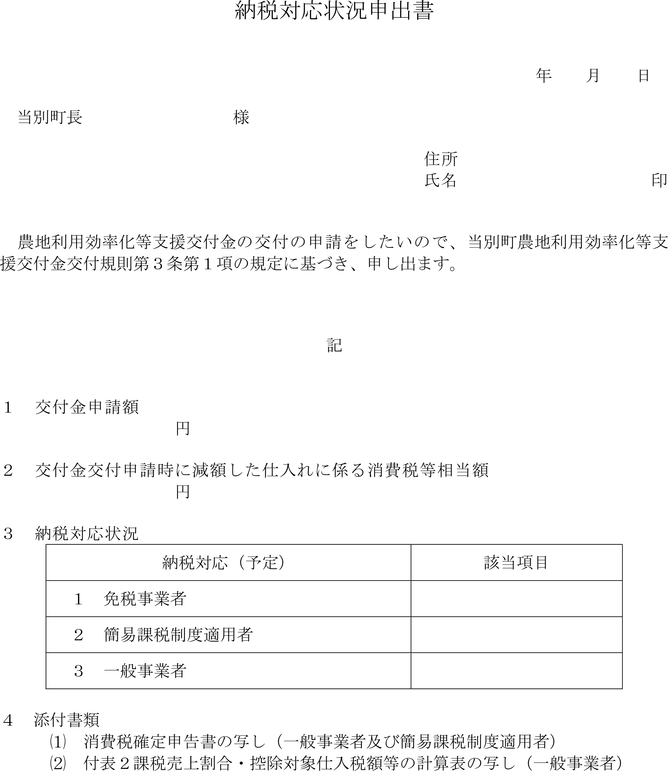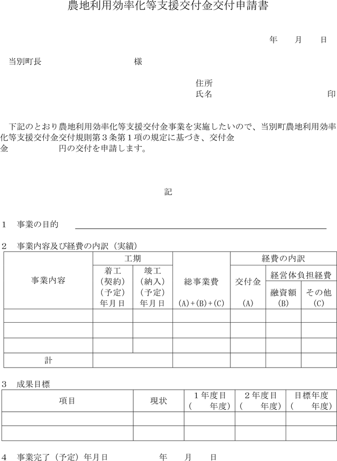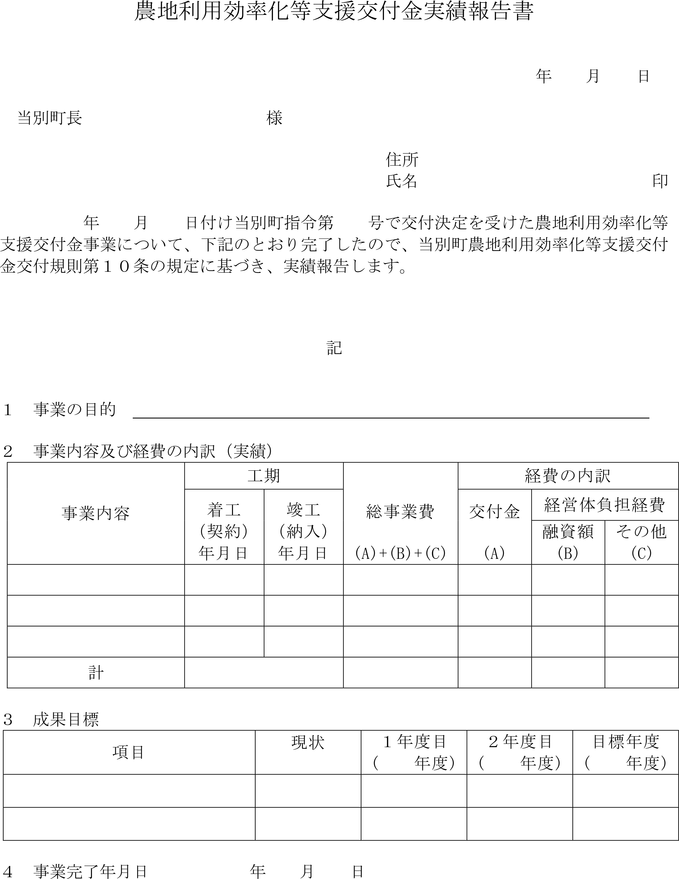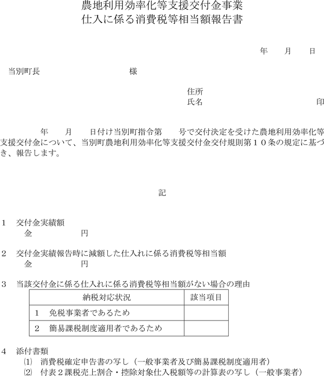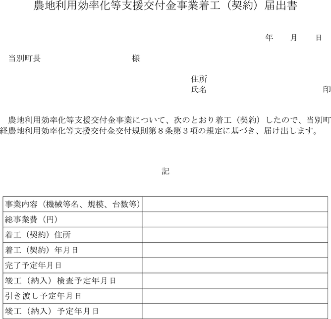 別記様式第12号)を、町長に提出しなければならない。ただし、前項の規定による農地利用効率化等支援交付金事業交付決定前着工(契約)届出書を提出している場合は、この限りでない。