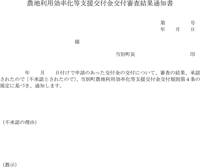 第4条 町長は、前条の規定による交付金の交付の申請があったときは、その内容を審査し、当該交付対象者に対し、農地利用効率化等支援交付金交付審査結果通知書(