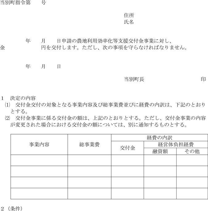 2 町長は、前項の規定による申請があったときは、その内容を審査し、当該交付決定者に対し、農地利用効率化等支援交付金事業中止(廃止)審査結果通知書(