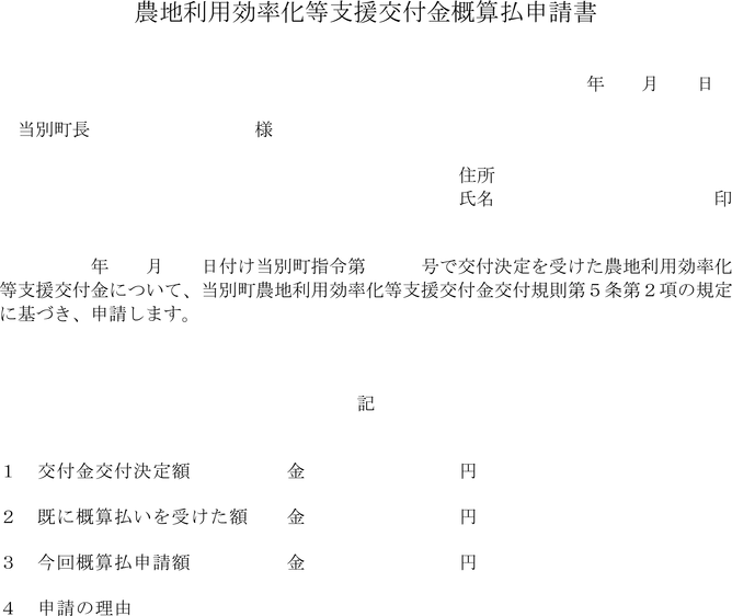 2 交付金の交付決定を受けた交付対象者(以下「交付決定者」という。)は、前項ただし書の規定により、交付金の概算払を受けようとするときは、農地利用効率化等支援交付金概算払申請書(