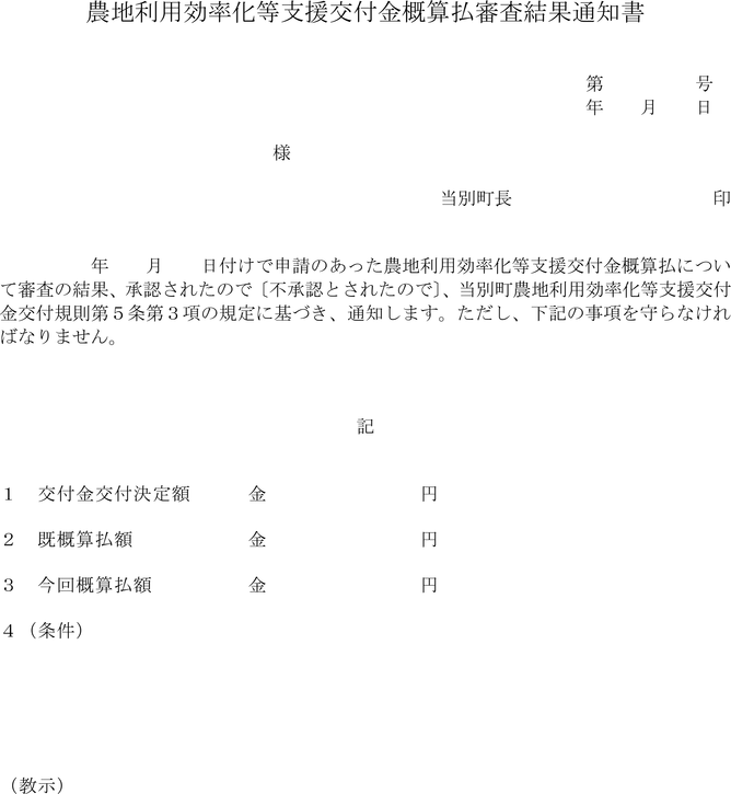 3 町長は、前項に規定する申請があったときは、その内容を審査し、当該交付決定者に対し、農地利用効率化等支援交付金概算払審査結果通知書(