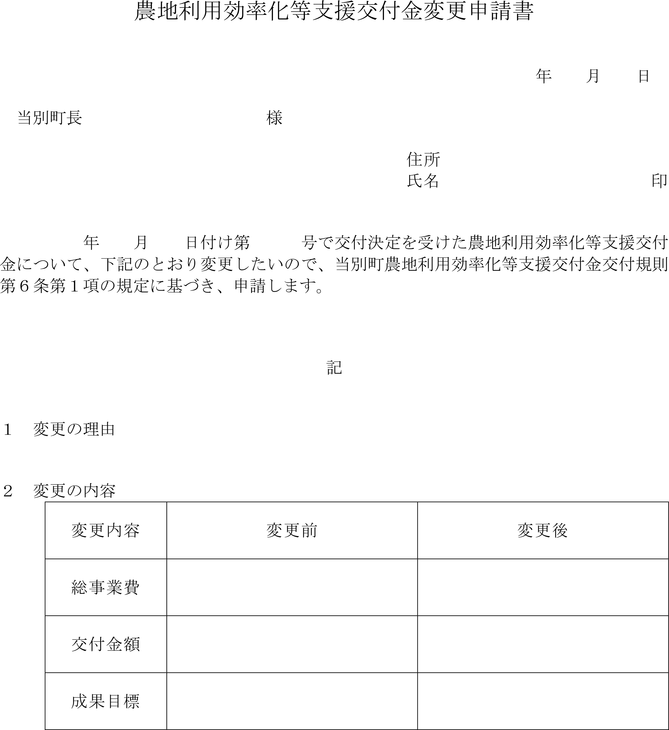 第6条 交付決定者は、交付決定後に次の各号のいずれかに該当するときは、農地利用効率化等支援交付金変更申請書(