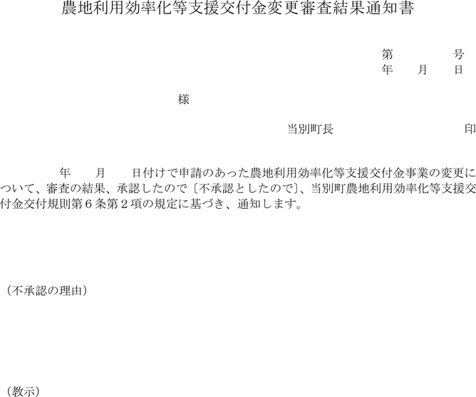 2 町長は、前項に規定する申請があったときは、その内容を審査し、当該交付決定者に対し、農地利用効率化等支援交付金変更審査結果通知書(