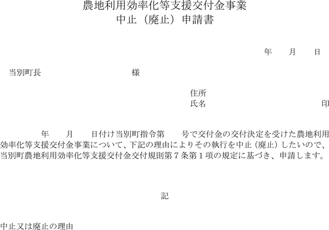 第7条 交付決定者は、やむを得ず交付金事業を中止又は廃止するときは、農地利用効率化等支援交付金事業中止(廃止)申請書(