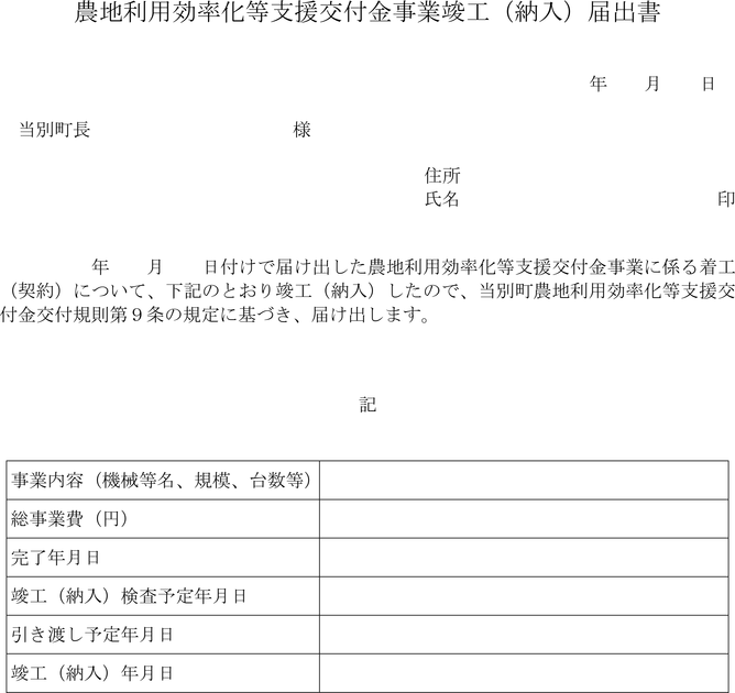 第9条 交付決定者は、交付金事業が竣工したときは、速やかに農地利用効率化等支援交付金事業竣工(納入)届出書(