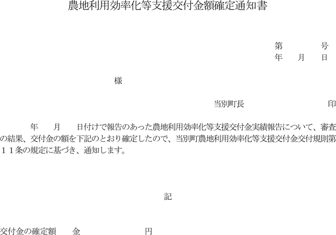 第11条 町長は、前条の規定による報告があったときは、交付すべき交付金の額を確定し、当該交付決定者に対し、農地利用効率化等支援交付金額確定通知書(