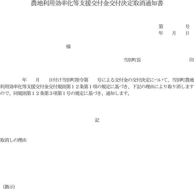 (1) 交付金の交付決定の全部を取り消す場合であって、かつ、当該取り消しによる返還金がないとき 農地利用効率化等支援交付金交付決定取消通知書(