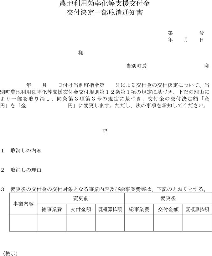 (3) 交付金の交付決定の一部を取り消す場合であって、かつ、当該取消しに係る返還金がないとき 農地利用効率化等支援交付金交付決定一部取消通知書(