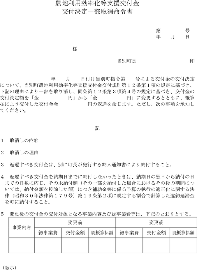 (5) 交付金の交付決定の全部又は一部を取り消す場合であって、額の確定後であり、かつ、当該取消しに係る返還金があるとき 農地利用効率化等支援交付金交付決定全部(一部)取消命令書(