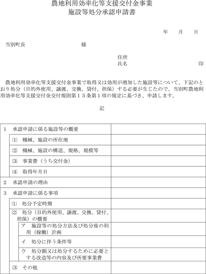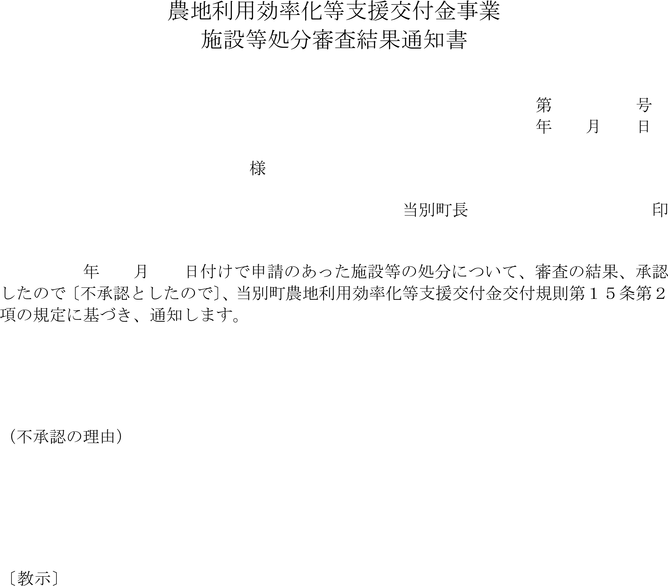 2 町長は、前項に規定する申請があったときは、その内容を審査し、当該交付決定者に対し、農地利用効率化等支援交付金事業施設等処分審査結果通知書(