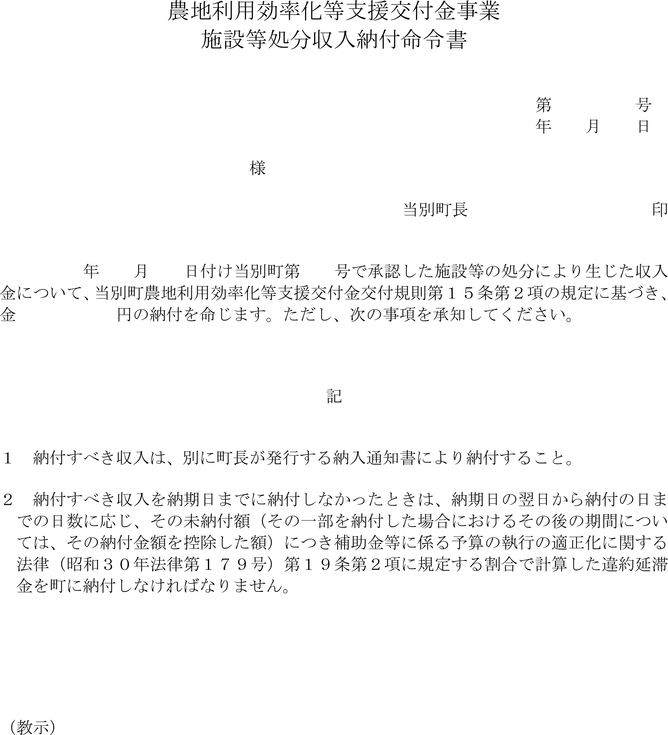 別記様式第24号)により通知するものとする。この場合において、承認を得て財産を処分したことにより収入があったときは、町長は、当該収入の全部又は一部を農地利用効率化等支援交付金事業施設等処分収入納付命令書(